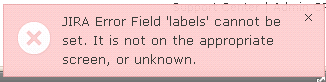 The error says: JIRA Error Field 'labels' cannot be set. It is not on the appropriate screen, or unknown.